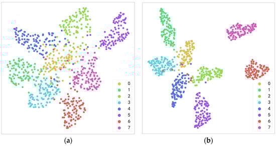 Overall, from the graph, it can be seen that when the epoch reaches 40, the loss and accuracy have basically converged, and the accuracy has reached nearly 100%. This indicates that the model performs well on the training set and has good generalization ability, which also verifies that the model structure and parameters chosen in this paper are correct. Setting the number of epochs too large can significantly prolong the training time and even cause overfitting, while setting it too small may not find the global optimal solution. After multiple tests, this paper set the learning rate to 0.001 and the number of epochs to 40, which is a good choice. To intuitively demonstrate the advantages of the proposed method in extracting fault features, this paper utilized the uniform manifold approximation and projection (UMAP) algorithm to perform dimensionality reduction on the data and visualize the results. Taking the steady state condition with a speed of 1600 rpm and a load of 7 kN as an example, this paper conducted a layer-by-layer analysis of ResNet models with and without CBAM and extracted the output features of the intermediate layers for calculation. Then, UMAP is utilized to reduce the dimensionality of the extracted features to two dimensions. This paper extracted the fault features from the avgpool layer and visualized the results using a scatter plot where different fault types are marked with different colors. The visualization is shown in Figure 5.