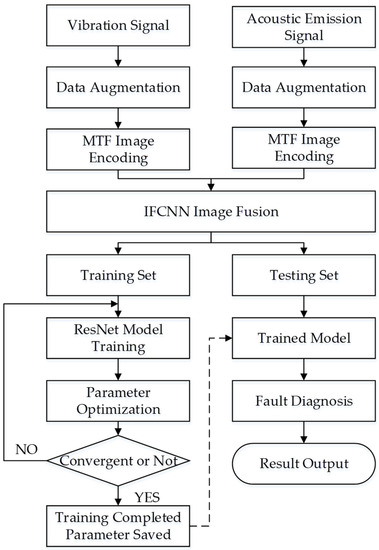 To enhance system stability and increase diagnostic reliability, this article collected vibration signals and acoustic emission signals and fused them for processing. This fusion processing can establish correlations between multiple signal sources. Usually, information fusion can be divided into three levels: data-level fusion, feature-level fusion, and decision-level fusion. Considering that the sample data in this study consist of MTF encoded images of different fault types, it is advantageous to employ CNN for image processing. Therefore, this paper adopted the IFCNN for feature-level fusion of the data.