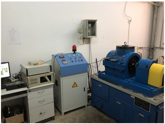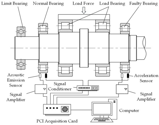 During the experiment, a healthy bearing and a faulty bearing were installed at both ends of the testing machine’s spindle, and vibration and acoustic emission signals were collected from both bearings simultaneously. The loading system applies radial loads to the spindle via a pair of NU2218 cylindrical roller bearings, which in turn are transferred to the test bearings at both ends of the spindle. The sensor signals are amplified and conditioned by signal amplifiers, signal conditioners, and input to the computer through a PCI acquisition card. The principle of the signal acquisition system is shown in Figure 7. The physical set-up of the system is shown in Figure 8.