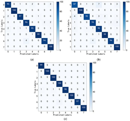 The confusion matrix provides a clear and intuitive visualization of the model’s misclassifications and the types of errors. It can be seen that the overall diagnostic performance is good, and the accuracy rate for the fusion of acoustic emission and vibration signals is almost 100%. However, the diagnosis accuracy rate for label 6, which corresponds to the “outer Ring + rolling element pitting” fault type, is relatively low. The model misclassified three test samples as “rolling element pitting”. Further analysis revealed that the two types of faults have similar features, making it difficult to extract differences between them. By comparing (a–c) in Figure 9, the results further confirm that multisignal fusion technology has higher reliability and accuracy compared to a single signal, especially under changing working conditions.