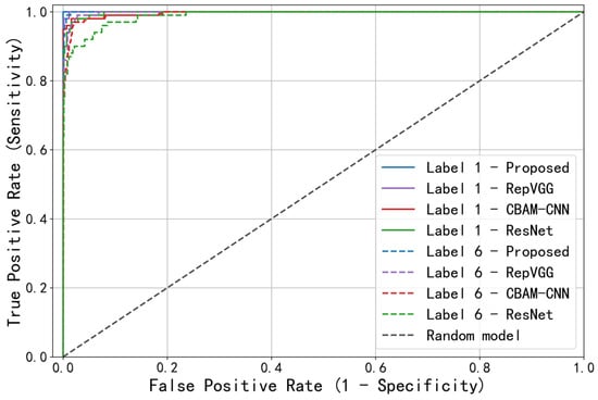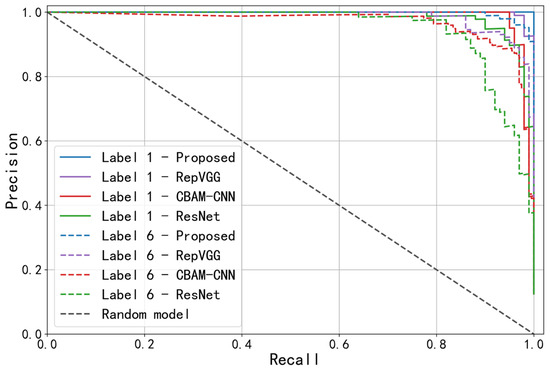To compare the feature extraction capabilities of different models, the training and testing sets samples of above-mentioned generic working conditions were respectively input into RepVGG, CBAM-CNN and ResNet models for diagnosis. Two types of faults were selected as examples: label 1 (corresponding to “inner ring pitting”) with better diagnostic results and label 6 (corresponding to “outer ring + rolling element pitting”) with poorer results. The precision–recall (PR) curves and receiver operating characteristic (ROC) curves were generated for the optimized ResNet, RepVGG, CBAM-CNN and ResNet models and evaluation indicators, such as average precision (AP) and area under the curve (AUC) were introduced.