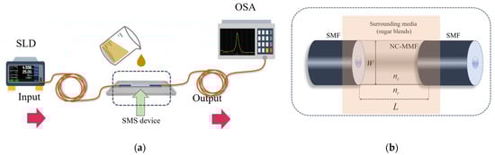 The well-common SMS structure of fiber optic MMI devices consists of an MMF spliced between two SMFs [28,29,30,31]. Typically, these sensors are tested in transmission using the experimental setup shown in Figure 1a, where a broad spectrum is fed into the sensor, and the output spectrum is measured with an optical spectrum analyzer; the setup will be discussed in more detail below. Moreover, if the cladding of the MMF is removed or absent, as in the case of an NC-MMF, then the structure can be used as the sensor of their surrounding media [31], as it is shown in Figure 1b.
