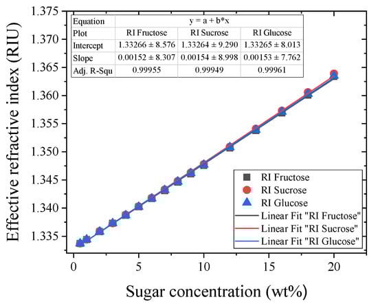 A common parameter used for the identification and quantification of the sugar content is the RI [39], as this optical property increases with its concentration and constitutes an important indicator of the quality of foods, beverages, fruits, and preserves [39,40]. Fortunately, the RI of aqueous solutions of different sugars has been well studied, constituting a standard reference of the US National Institute of Standards and Technology [41,42]. In particular, Ref. [42] reported the measurement of the effective RI of aqueous solutions of sucrose, fructose, and glucose at a temperature of 20 °C and a wavelength of 589 nm. These data are plotted in Figure 2, in the range of interest from 0 wt% to 20 wt%, where it can be seen that the effective RI of the aqueous solution increases linearly with the concentration ( in all cases) as , with and , where is the slope of the linear dependence (slightly different for each type of sugar), and is the sugar concentration (in units of wt%). Here, we note that the three different sugars have a similar concentration behavior.