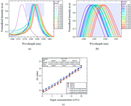 (a) Spectral response of the MMI sensor for water–sucrose blends. (b) The shaded box shows in more detail the region of the spectral change in panel (a), which corresponds to the NC-MMF section surrounded by each sugar type concentration. (c) The spectral shift of the peak wavelength, with respect to the baseline condition, as a function of the concentration of sucrose, fructose, and glucose present in the aqueous solution.