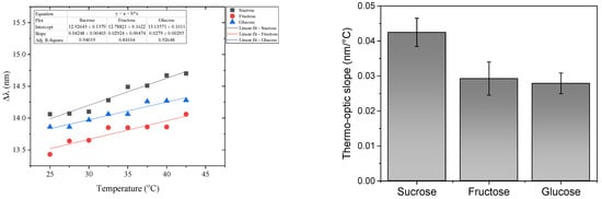 From the results shown in Figure 4, it can be seen that under thermo-optic effects, the spectral shift for each type of sugar separated from the others, in contrast to the behavior when the temperature was maintained as constant and where the slopes were similar to each other, and the sugars could not be distinguished (see Figure 3). Therefore, the thermo-optic response of aqueous solutions of sugar could be used as a tool to discriminate among sugars. This stems from the fact that the thermo-optic coefficient increases with the molecular weight of the material, as it has been widely studied in glasses [47] and polymers [48]. From Figure 4b, it is evident that disaccharides (sucrose) can be clearly distinguished from monosaccharides (glucose and fructose). Surprisingly, the small difference between the thermo-optic coefficient of fructose (180.160 g/mol) and glucose (180.156 g/mol) captures the small difference in their molecular weight, which reflects the high sensitivity of the sensor presented.