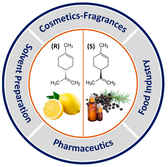 The availability of the pristine material, essentially created through distillation or centrifugation from plant waste, together with its appreciated organoleptic properties, allows it to find space in numerous industrial applications. For instance, thanks to its pleasant citrus smell and characteristic taste, limonene is often exploited in the food and beverage industry as a flavoring and preservative element (e.g., in fruit juices, baked goods, sweets, chewing gums, ice creams, etc.). In addition, it is widely used in beauty and personal care products, such as soaps, shampoos, perfumes, and cosmetics in general. Finally, it can also be found in household products (detergents, cleaning products, room fresheners), in certain types of natural solvents, and as the active principle in ecological pesticides [