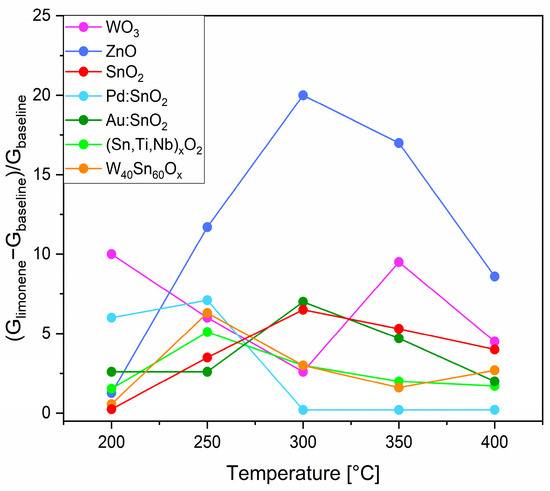 Sensing performance. The sensor performances were proven by making a complete electrical characterization. First, the best operating temperature of each MOX film was investigated considering their response to 1 ppm of R-(+)-limonene at increased working temperatures, ranging from 200 to 400 °C. Then, in order to study the sensitivity, the films were exposed to several concentrations of R-(+)-limonene (100, 200, 300, 500, 1000, and 5000 ppb) under dry conditions. To verify the influence of possible interfering compounds, they were also exposed to two concentrations (5 and 10 ppm) of different volatile analytes, such as acetone, acetaldehyde, and ethanol. Gases and concentrations were chosen in order to cover chemical species that might be relevant for cosmetics and similar above-mentioned applications. For instance, the effective detection and monitoring of targeted gas in cosmetics, namely ethanol and R-(+)-limonene, are essential for product quality and human skin care. The selectivity coefficient (