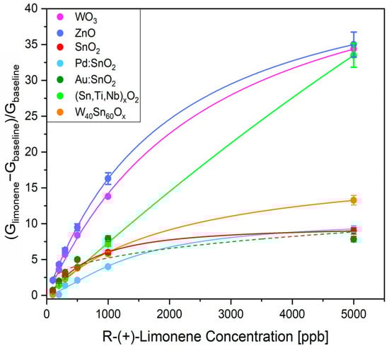 3 and ZnO sensors at each tested concentration exhibited higher responses than the others and they did not saturate at the highest value (5000 ppb). Therefore, they can detect R-(+)-limonene gas in a wide range of concentrations that are typically found in many of the applications mentioned. Moreover, despite a low response below 1000 ppb, the (Sn,Ti,Nb)