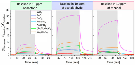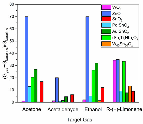 Figure 4 shows the sensors response vs. 5 ppm of R-(+)-limonene, acetone, acetaldehyde, and ethanol. All samples exhibited an n-type sensing behavior, namely, a conductance increase during exposure to reducing gases, see