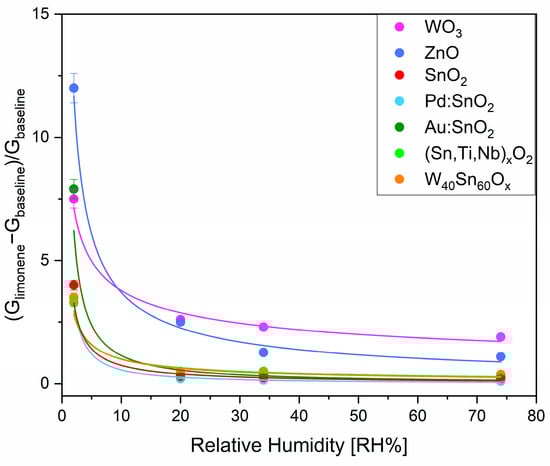 19]. To explore its effect on the sensor performance, 500 ppb of R-(+)-limonene was injected into the gas chamber at different percentages of relative humidity, from 2 up to 74 RH%.