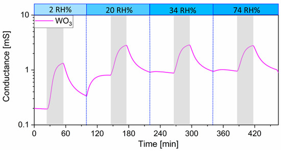 Figure 7). Firstly, one can observe an increase in the baseline conductance of the sensitive film when the sensor was exposed to 20 RH% due to the homolytic dissociation of water, which reacted with the metal site and a lattice oxygen to form a terminal and a rooted hydroxyl group. The latter acted as a surface donor, freeing an electron to the conduction band [
