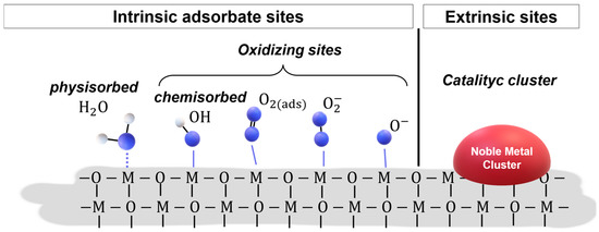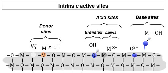 Figure 8 provides a schematic two-dimensional representation of the intrinsic active sites at a pristine MOX surface. This includes coordinately unsaturated metal cations and oxygen anions, point defects (cationic and anionic vacancies, atomic interstitials, and dislocations), and –OH groups in hydrated MOX [