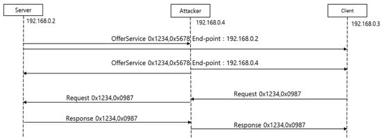 Figure 2 shows a representative SOME/IP MITM attack [12]. If a server (192.168.0.2) sends an OfferService message for its service (the service ID is 0x1234, and the instance ID is 0x5678) by multicast, both a legitimate client (192.168.0.3) and an attacker (192.168.0.4), who has successfully invaded an in-vehicle network, can receive the message. The attacker changes the message’s endpoint to their own and re-sends it via multicast. Now, the client wants to use the service and sends a request. Depending on the SOME/IP implementation, the client can request the service to the first or last offered endpoint. Suppose the client sends it to the last provided endpoint, that is, the client sends a Request message to the attacker. Then, the attacker forwards it by changing its endpoint to the attacker’s. When a server receives a Request message from an attacker, it sends a Response message, and then the attacker can read and change the data as they want and re-send the message to the client. In this way, an MITM attack can occur. A detailed description of representative MITM attacks is explained in the blog [12] written by Shir Mousseri from ARGUS cyber security. Zelle et al. [13] present various MITM attack scenarios that can occur in SOME/IP, as well as the feasibility of the attacks in detail. Since actual vehicle control messages can create hazardous situations when attacked, a method that mitigates MITM attacks and does not affect the vehicle’s requirements is needed. Several proposals have been published as a result of these studies.
