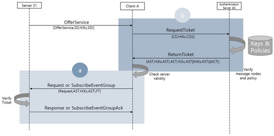 In general SOME/IP communication, the Server S1 multicasts/unicasts OfferService messages to clients. In the proposed method, the OfferService message is transmitted with a flag that indicates that the service requires an authentication ticket corresponding to the importance of the provided service. Assume that Client A receives the OfferService message and wants to subscribe to this service. First, our method verifies whether the corresponding service requires a ticket. If it is not needed, it immediately responds in the original communication method (e.g., Request message). This is shown in process “a” of Figure 3. After this, our method additionally performs process “b” to obtain an authentication ticket if necessary. The formulas under the directed edge for each step represent the rough composition of added data when a ticket is required. Table 2 shows the used notation in the figure and corresponding detailed descriptions, which can be found starting in Section 4.4 of this paper. In process “b”, two messages are added: a RequestTicket message, which requests an authentication ticket from the AS, and a ReturnTicket message, which returns the requested authentication ticket. The proposed scheme consists of four phases: OfferService, RequestTicket, ResponseTicket, and Request.