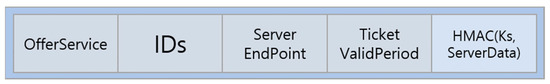 This message is sent as a multicast or unicast message to notify the client that the server provides a specific service. In this phase, the server can set a flag to indicate whether or not an authentication ticket is required to use the service, which can be selectively applied depending on the importance of the service. In actual implementation, this flag is set using unused bits in the message types of SOME/IP messages. When creating an OfferService message that requests a ticket for the service in the server, ServerData is additionally configured, as shown in Figure 4 below, after the original OfferService message payload part. For a detailed description of the notation used in Figure 4, refer to Table 3.
