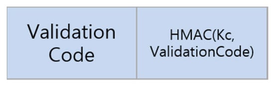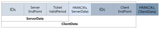 If the validation code in Section 4.6 contains an error, the AS generates an HMAC value relating to the error code with the client’s long-term key Kc and sends it to the client as a ReturnTicket message, as shown in Figure 6. If the validation code is “verification success”, the AS is formatted as shown in Figure 7. For a detailed description of notation, refer to Table 5. The session key is generated as a cryptographically secure random value after confirming the kind of service in the AS. The overall configuration of the ReturnTicket message is divided mainly into AuthServerTicket, which is used for verification in the server, and AuthClientTicket, which is used for verification in the client.