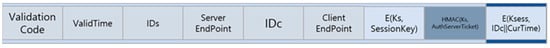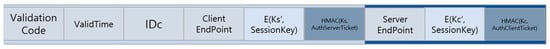 After the client receives the ReturnTicket message delivered from the AS, it first checks the HMAC part corresponding to AuthClientTicket using its key to check whether the message has been falsified or altered. If there is no problem, the AS confirms the validity code to verify the authentication and mutual relationship between the server and itself through ValidationCode in AuthServerTicket. If this is successful, the AS gets the session key by decrypting E (Kc’, SessionKey) with key Kc’ derived from its long-term key Kc. After this, FreshnessToken is created, as shown in Figure 8. FreshnessToken is encrypted with the session key after attaching IDc and CurTime, which is the time when FreshnessToken was created. This FreshnessToken is added after AuthServerTicket’s HMAC and is sent to ServerEndPoint, as shown in Figure 9.