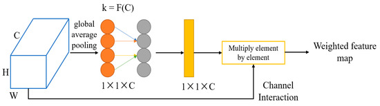 The feature map is transformed from a matrix to a 1 × 1 × C vector through average pooling. The formula for the adaptive one-dimensional convolution kernel size k is shown in Formula (1). By adjusting the kernel size, the weight of each channel in the feature map is obtained. Then, the obtained weights are multiplied with each channel of the original input image to obtain the feature map with attention added.