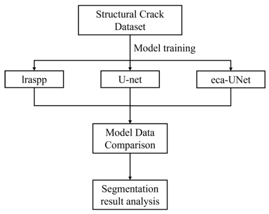 Based on the research content of this article, the technical roadmap is shown in Figure 2 below. We trained three networks, lraspp, U-Net, and ECA-UNet, with existing public datasets. The performance of the three networks was analyzed based on the data obtained from the network training, and the effects before and after adding attention mechanisms were compared. Finally, actual cracks were used for image-segmentation and recognition–visualization comparison analysis in the real structure.