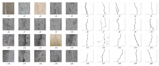 This section first compares the performance of the U-Net network and the lraspp network. The training set used 5000 images with and without cracks from the bridge-crack library [47], with a crack-to-non-crack image ratio of 4:1. A validation set of 1000 crack images was used. The training dataset for the crack images included cracks in vertical, horizontal, and diagonal orientations. Part of the dataset is shown in Figure 3. Each crack image had a size of 256 × 256 pixels. After fine annotation with annotation tools, each crack image was paired with a PNG data label corresponding to the JPG format original image. All three models were iterated 200 times, and the training results are shown in Table 1. The lraspp model did not perform better overall than U-Net on the test set. In terms of precision, the value for lraspp was 0.810 and for U-Net was 0.921, indicating that lraspp was 0.111 less precise than U-Net. In terms of IOU, lraspp was 0.097 less than U-Net, and in terms of recall, lraspp was 0.051 less than U-Net, with lraspp having a value of 0.588 and U-Net having a value of 0.639.