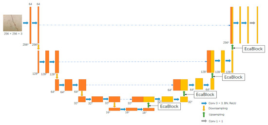 The ECA-UNet after adding the attention mechanism is shown in Figure 4. On the original U-Net structure, we added the attention mechanism ECA to the sampling part of each layer. Because the downsampling part is the main feature-extraction network, adding the attention mechanism to the trunk-extraction part of the downsampling part will interfere with the weight of the original network on image–feature extraction; furthermore, it will cause the model to be unable to accurately judge and distribute the features. Therefore, we added the ECA attention mechanism to enhance the feature pick-up network; that is, by up-sampling each layer, a total of 4 points was added. The feature graph optimized by the attention mechanism was then fused with the five effective feature layers obtained by the backbone network, and finally the classification output was obtained through 1 × 1 convolution.