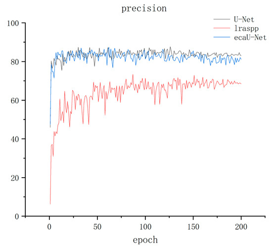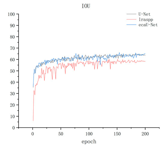 The training results are displayed in Figure 5, Figure 6 and Figure 7 below, where Figure 5, Figure 6 and Figure 7 show the precision, recall, and IOU curves of the three models after training. From the precision curve, it can be observed that lraspp oscillates around 65% without showing a significant upward trend. While ECA-UNet and U-Net overlap in the early stages, ECA-UNet has a tendency to oscillate downwards compared to U-Net after about 140 epochs, although both maintain around 80%. From the recall curve, it can be seen that lraspp performed well in terms of recall, but with more spikes in the curve than the other two models. A clear restrict relationship between recall and precision is noticeable, meaning that the model did not balance the relationship between these two indicators well. However, ECA-UNet performed better than U-Net after about 150 epochs, showing a gradual upward trend. From the IOU curve, it can be seen that lraspp performed poorly, not as well as the other two networks. The ECA-UNet curve overlaps with the U-Net curve to a high degree, and the upward trend is similar. Based on the above analysis, lraspp performed poorly in both metrics and did not balance the relative relationship between precision and recall well. On the other hand, ECA-UNet performed well in terms of recall and IOU, especially surpassing U-Net in terms of recall.