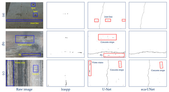 It can be seen that although the lraspp network was not cheated by all kinds of noise motifs in the raw images, it recognized very few parts of the crack regions. It missed the majority of the crack regions in Figure 8b,c, and it missed all the crack regions in Figure 8a. As for the U-Net, it almost successfully detected all the crack regions in all three of the testing images. Nonetheless, U-Net’s recognition results contained a small number of non-crack noise motifs. Part of the joint line in Figure 8a was misidentified as cracks, and the concrete strips and the pitted area in Figure 8b were also misidentified as cracks. Moreover, part of the water stains and the concrete strip in Figure 8c were mistakenly recognized as cracks. This indicated that U-Net could achieve satisfactory performance in detecting the cracks but the robustness against noise motifs was not enough. When it came to the ECA-UNet, which was based on the U-Net and modified by adding the attention mechanism, a better performance was achieved. It accurately recognized the crack areas in the raw crack images. Yet, part of the concrete strip in Figure 8c still caused error detection.