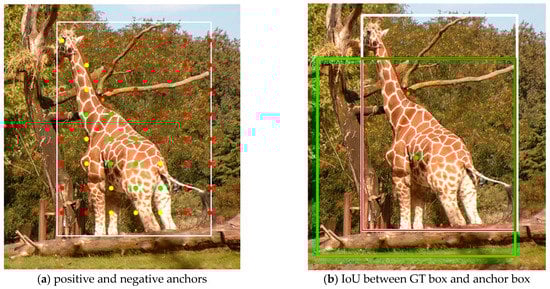 Positive and negative sample assignment refers to the process of determining whether each anchor should be assigned as a positive or negative sample during training, a process also known as training sample selection, anchor assignment, and label assignment. Anchor assignment during training is an important factor affecting the performance of the object detection model. Figure 1a shows the anchor inside the GT box. The white box is the GT box and the different colors of anchors represent the high or low quality of the anchors. The red anchors are located in the background rather than the object and should be classified as negative anchors. The yellow anchors contain part of the object information and hence are not optimal positive anchors. Green anchors contain rich object information and should be used as positive anchors. Anchor assignment is used to pick out the green anchors and avoid the red anchors. The white box in Figure 1b is the GT, the green box is one of the anchor boxes corresponding to the green anchor, and the red box is their intersection area. By calculating the proportion of the intersection area to the concatenation of the two boxes, the IoU of the anchor box and the GT box can be obtained. We hope that the IoU of the predicted box and the GT box is as large as possible, rather than the IoU of the anchor box and the GT box.