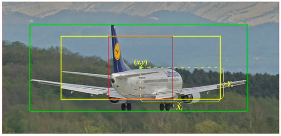 In these equations,  is a hyperparameter, and . From these two distances, the coordinates of the four vertices of the center region with EPCP can be determined as , , , and , respectively. Through EPCP, the short side of the center region of each GT box is , and the center region maintains the same aspect ratio as the GT box. Figure 2 shows the center region obtained from EPCP; in this figure, the green box is the GT box, the yellow box is the center region of EPCP with the same aspect ratio as the GT box, and the red box is the center region of CP. The red box is still square when the GT differs greatly in length and width.