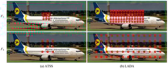 As shown in Algorithm 1, the process of positive and negative sample assignment by LADA is described. A preliminary matching is performed before the assignment, referring to the practice in PAA [] that assigns the anchors to the GT box with the largest IoU. Meanwhile, the anchor-free detector refers to the practice in ATSS [] that gives each anchor a flat  anchor box before the preliminary IoU matching. When an anchor is assigned to more than one GT box, the GT box with the largest IoU of the anchor will be selected. The IoU threshold here is consistent with that in PAA, set to 0.1. The anchors containing too much background are omitted, and the most original positive sample candidate set is constructed. The anchors both in the GT box and the center region of EPCP are the first round of candidate positive samples . Then, the CLA of  is calculated, and  anchors with smaller CLAs are selected in each layer as the second round of candidate positive samples . Finally,  anchors with smaller CLAs are selected as the third candidate positive samples . The mean CLA value of  is calculated as the DLT to distinguish the positive and negative anchors, so the positive anchors  and negative samples  are obtained.