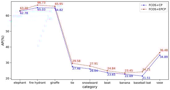 where  is the number of categories. The evaluation metrics used in the experiments of this paper are consistent with [,,], using mainstream COCO evaluation metrics, mainly including AP, AP50, AP75, APs, APm, and APl, where AP is the main evaluation metric, using the mean value of mAP at different IoU thresholds. The value of mAP is calculated every 0.05 in the interval of IoU from 0.50 to 0.95, and the average value of all results was taken as the final result. Therefore, the AP in COCO evaluation metrics is more stringent and is no longer the common AP of a single category. The AP values mentioned in the experimental data in this paper are all calculated in this way, which is the most commonly used evaluation metric in the COCO dataset. AP50 and AP75 denote the mAP values when the IoU threshold is 0.50 and 0.75, respectively, that is, AP50 for  and AP75 for . APs, APm, and APl represent the AP of small, medium, and large targets, respectively.