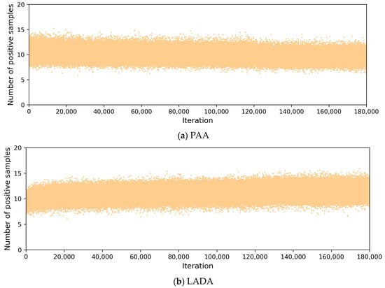 To compare with PAA, which divides samples dynamically, Figure 9 plots the number of positive samples in the training processes of PAA and LADA. The number of positive samples per iteration in Figure 9 means the average of the number of positive samples of all GT boxes in all images in one iteration, totaling 180k iterations, and the number of images in one iteration is equal to the batch size. In Figure 9a, the positive samples of PAA were obtained by iterating the GMM, and the number changed dynamically. From Figure 9b, we can see that the number of positive samples selected by DLT in LADA for each iteration is also not fixed, but determined according to the CLA, and the number of positive samples is mainly concentrated in the range of 8 to 14, showing better adaptability. Both LADA and PAA can determine the number of positive samples dynamically according to the loss of anchor.
