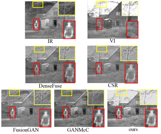 To visually exhibit the superiorities of our method, we select some representative end-to-end methods, including DenseFuse [18], CSR [17], FusionGAN [22] and GANMcC [24] for comparison, as presented in Figure 1. Clearly, all comparison methods generate the fusion results with blurry thermal targets and insufficient textures, together with halos along the edges. By contrast, the fused image generated by our method keeps the high-contrast heat sources, reserves the richest and most natural background texture details, and accommodates human visual perception.