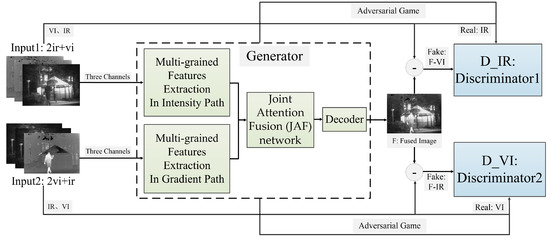 In the training phase, the aim is to train a generator that can generate the preliminary fused image to fool the dual discriminator. The framework of our proposed method is schematically shown in Figure 2. Firstly, the two inputs of the proposed model are constructed by means of combining infrared and visible images in the difference ratio concatenation manner [37]. The inputs are then passed through two independent paths (i.e., intensity path and gradient path) to extract deep features at different scales via a multi-scale feature extraction (MFE) network. Secondly, the features extracted from the dual paths are recalibrated via the joint attention fusion (JAF) network, so that the final fusion results will preserve more important features. Thirdly, we can obtain a preliminary reconstructed fused image via a single decoder under the guidance of the hybrid loss function. Finally, the adversarial game with two enhanced discriminators (i.e., D_IR and D_VI) will compel the generator to preserve more meaningful information of both source images. Concretely, we input both sources and their contributions into the dual discriminator separately to discriminate which of the inputs are from source images. The above training process is repeated until neither discriminator can distinguish the contributions from the visible or infrared images. As a result, we obtain a well-trained generator capable of producing fused images containing more meaningful information. In other words, the combination of the generator with both MFE and JAF and enhanced discriminators can retain the salient features of the sources well, including prominent targets in infrared images and rich background textures in visible images.