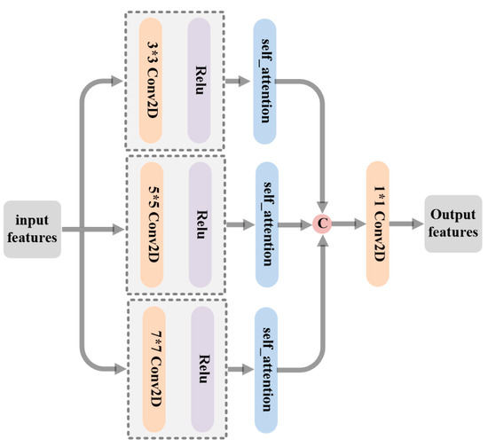 where represents the input of the MFE block, represents the convolution operations with different scales, and , , represent features extracted with different kernels sizes, respectively.