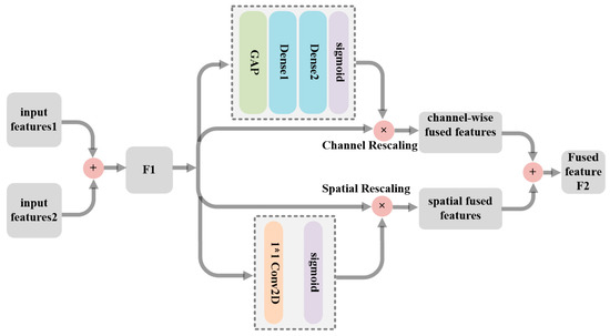 In the spatial dimension, the purpose is to concentrate on which parts of the output are rich in effective information, which can bridge the shortage of only using channel attention to some extent. We utilize a simple yet effective convolution layer to learn the importance of each input feature F1. Similarly, the weight coefficients are also obtained by sigmoid, which means the amount of information contained in each feature. At last, the informative features (i.e., the spatial fused features) can be obtained by multiplying the weight coefficients by the initial fused feature F1. The process of using spatial attention to enhance features can be shown in Equation (13):
