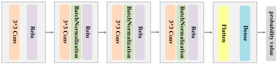 In our work, the two enhanced discriminators have the same structure. Figure 7 presents the architecture of the discriminator, which consists of four convolutional blocks. A convolution layer with kernel and ReLU is applied in the first four blocks. It is worth noting that all convolution blocks except the first one employ batch normalization operations to improve the convergence speed. Subsequently, the flattened data are fed into a full-connection layer that outputs a scalar value of the estimation probability. Unlike the generator, the stride of each convolution layer is 2 and has no padding.