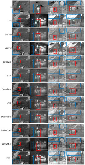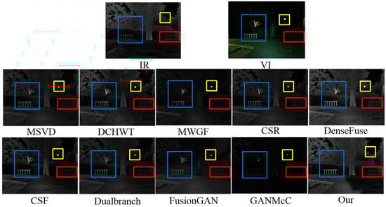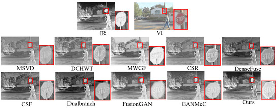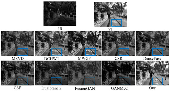 The source images on the MSRS dataset contained diverse scenarios and illumination variations. We implemented testing experiments on 20 daytime infrared and visible image pairs from the MSRS dataset. Figure 11 shows one of the fusion results for the different methods. Some discriminative regions are highlighted by blue rectangles. Infrared images highlight the thermal targets, while visible images provide rich details and strong contrast and illumination. One can see that the fusion results for MSVD, CSR, DenseFuse, CSF, and GANMcC exhibited low contrast and lighting. To make matters worse, the Dualbranch and FusionGAN methods severely lost the texture details contained in the visible images, such as the words on the ground. Although the DCHWT and MWGF methods achieved relatively good fusion results, our fused image contained more and richer details and were better and brighter than theirs. These advantages can be attributed to the multi-scale feature extraction and attention-based salient feature fusion strategies included in the proposed method.