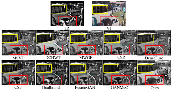 Additionally, 20 pairs of nighttime infrared and visible images from the MSRS dataset were selected for evaluation testing. In the nighttime scenario, the quality of the visible images was degraded by insufficient illumination. Hence, the fused images should have retained more texture details of the infrared images to enhance the description of the night scene. Figure 12 shows representative fusion results for the proposed method and its competitors. The discriminative regions are marked with different color boxes. Obviously, the MWGF, FusionGAN, and GANMcC methods failed to highlight the objects labeled by the red boxes. The fusion results generated by the MSVD, MWGF, CSR, DenseFuse, CSF, and Dualbranch methods were blurred in some regions. Although our method preserved more texture details from the source images, some important targets were still lost. Existing traditional and learning-based methods are designed for the fusion of infrared and visible images with normal exposure, and they do not specifically study the illumination imbalance problem. As a result, the state-of-the-art algorithms, including ours, failed to achieve satisfactory fusion results in the nighttime image fusion task. Therefore, designing robust image fusion methods that can sense illumination conditions will be a hot research topic in the future.