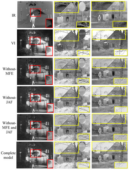 Comparing the above ablation results with ours from the viewpoint of intuitive assessment, it was found that they all achieved good fusion performance. However, intuitively, the presence of texture detail loss and artifacts in the ablation results were still observed. We attribute the dip in performance to insufficient feature extraction and fusion. The complete model could reduce the likelihood of unnecessary artifacts by combining MFE and JAF.