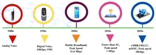 The massive volume of data traffic worldwide has increased manifold, so conventional antennas such as PIFA and monopoles cannot meet the demand. New multiple antenna technology with array and MIMO antenna is a promising technology to provide better channel capacity with additional bandwidth or transmission power. MIMO and m-MIMO are the next generation technology for mobile communication which groups multiple elements at the transmitter (Tx) and receiver (Rx) which provide better spectral efficiency, higher data rate, and channel capacity [,]. Figure 1 shows the evolution of cellular technology from 1G to 5G. With the introduction of first generation (1G) cellular networks in the 1980s, cellular technology has experienced substantial progress. With each new generation, network speed, capacity, and functionality have improved, enabling more advanced mobile devices and apps.