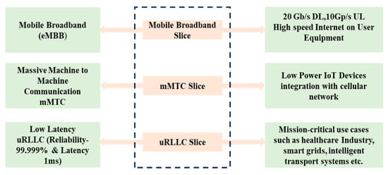 Network slicing is another feature of a 5G wireless network that allows many virtual networks to be formed within a single physical network, enabling telecom operators to deliver customized services to users as per the scenario shown in Figure 4. In a traditional wireless network, all the users share the same network resources, which can limit the capability of the network to sustain a wide range of services with varying requirements for bandwidth, latency, and reliability. A network slice is a distinct and isolated network portion designed to be self-contained and secure. It is created by logically separating resources to fulfil specific user needs, taking into account the quality of service (QoS) provided by the slice. The concept of network slicing enables efficient allocation of network resources, resulting in cost optimization and the ability to meet diverse requirements. In essence, network slicing allows for the customization and fine-tuning of network capabilities to best suit the individual needs of different users or applications. Network slicing enables operators to create virtual networks with unique resources and characteristics to support diverse services and applications. Each network slice is tailored to meet the specific needs of a particular facility or application, such as low latency for autonomous vehicles or high bandwidth for video streaming. Network slicing is a key feature for many 5G use cases, such as smart cities, industrial automation, and healthcare. It enables operators to provide customized facilities to different users and applications, and it enables the network to support a broad range of services with varying requirements for bandwidth, latency, and reliability [,].