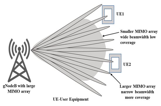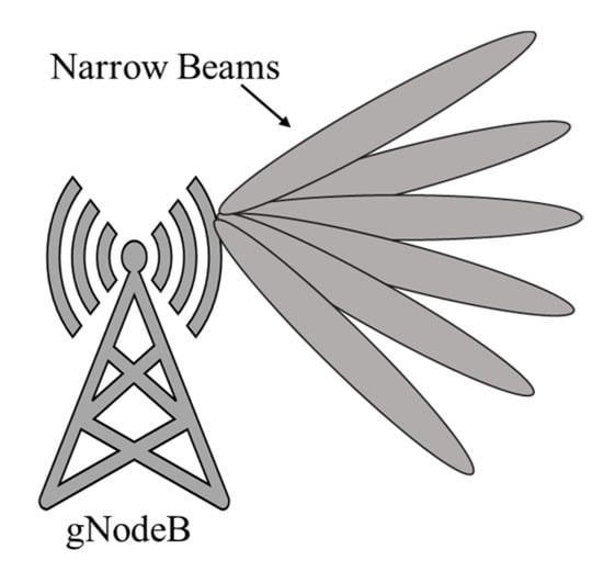 Carrier aggregation involves the combination of multiple frequency bands to create a wider frequency band, which can provide higher data rates and better performance [,]. This enables operators to make more efficient use of the available spectrum and provide a higher quality of service to users. Beamforming involves the directional transmission and reception of signals between a base station and user equipment. It uses multiple antennas to create narrow beams that can be directed toward specific users or devices, rather than broadcasting signals in all directions as shown in Figure 5. This enables operators to provide higher data rates, better coverage, and more efficient use of the available spectrum. Beam-forming is a critical technology for millimeter wave (mmWave) frequencies, which are used in some 5G networks to provide extremely high data rates. mmWave frequencies have high propagation losses, which means that they are easily absorbed by objects in their path, such as buildings and trees. Beamforming enables operators to overcome these propagation losses by directing the signal towards specific users or devices, rather than broadcasting it in all directions.
