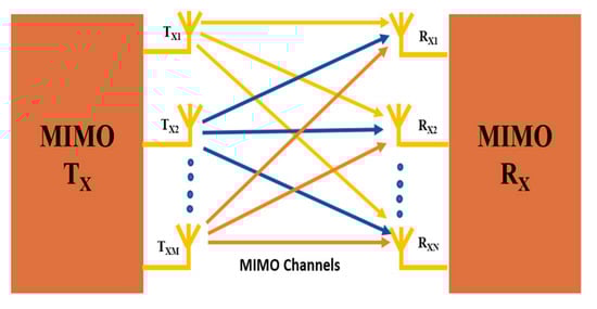 Compared to SISO antenna systems, MIMO antennas exhibit higher channel capacity, which is a crucial performance parameter as given by [,,]. The MIMO Tx/Rx block diagram with MIMO channel is shown in Figure 6.