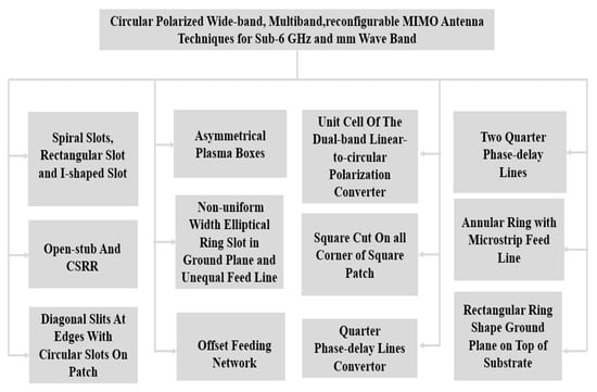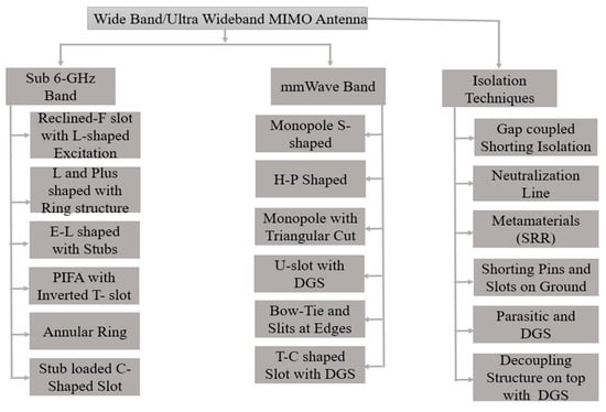 Wideband MIMO antennas are designed to operate across a broad frequency range, typically spanning multiple frequency bands within FR-1 and FR-2. These antennas employ various techniques to achieve wide frequency coverage, such as broadband feeding networks and radiating elements. Wideband MIMO antennas are capable of supporting multiple frequency bands simultaneously, providing enhanced spectral efficiency and compatibility with different wireless communication standards. The categorization of wideband MIMO antenna for sub-6GHz band and mmWave are shown in Figure 11.