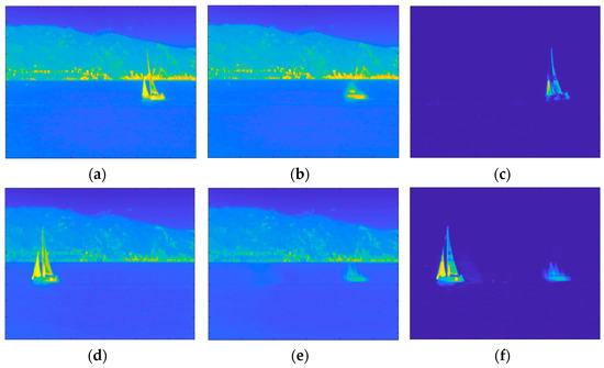 Figure 3 shows the effect of the burn-in ghosting in a sequence in which the target was present at the beginning of the recording. The upper row shows one of the first frames of the video sequence, which is included in the burn-in sequence, while the lower row shows a later frame, which is outside of the burn-in sequence. Alongside both frames, the corresponding background and foreground estimations are represented. It is worth noting that the presence of the target in the burn-in sequence affects the estimations and, even though the target is moving at a constant speed, the ghost remains in the position assumed by the boat in the burn-in sequence and does not move towards the successive positions.