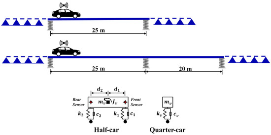 In the original articles, Li et al. [31] and Yang et al. [42] ignored the damping in the bridges while developing the reference car and half-car methods, respectively. On the other hand, Yang and Wang [39] considered the bridge damping and demonstrated, to a certain extent, the potential impacts of the bridge damping on vehicle scanning methods. In this article, bridge damping was not considered as its effect was previously shown to be minimal in the forced-vibration phase of the vehicle–bridge interaction [31,35]. Vehicle damping was considered via viscous dampers, as shown in Figure 2.