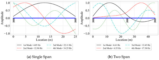 We evaluated the capabilities of VSMs in estimating mode shapes on two bridges. Figure 2 presents an overview of the two bridges along with the numerical models of the car models used in the study. The first bridge is a 25 m long single-span bridge while the other is a two-span bridge with span lengths of 25 m and 15 m. An unsymmetrical bridge was chosen on purpose because it potentially represents a more challenging task for the VSM methods and is common in practice. The bridges were modeled in ABAQUS software using Bernoulli beam elements discretized at intervals of m. Table 1 presents the properties of the bridges and vehicles. We aim for the numerical models of the bridges used to test the efficacy of the VSMs to be as realistic as possible. Therefore, supports were modeled using elastic springs, which emulate the behavior of bearings that are often used in bridges to attenuate the thermal and seismic effects. The supports were assumed to be fixed in the longitudinal and transverse directions as the stiffness in these directions does not have a significant impact on the vertical behavior of the bridge. Although the supports in the existing bridge were shown to have some rotational stiffness due to several reasons such as aging [50], these effects were ignored, and the supports were modeled as free to rotate. Since the main novelty of the article lies in the effect of the elastic supports at the ends of the bridge, the value of its stiffness plays a crucial role. Most of the commercially available elastomeric bearings, which is the most common bearing type used in bridges, have a vertical stiffness between kN/m and kN/m [47]. We conducted a sensitivity study to select a value in this range and, as expected, the lower bound of the range, i.e., kN/m, provided the highest modal displacements. Since this case, arguably, provides the most critical situation in terms of estimating the mode shapes at the edges of the bridge, kN/m was selected to be used in the analysis. The boundary conditions at each support of the bridges were kept constant with an elastic spring coefficient of kN/m in all the numerical simulations.