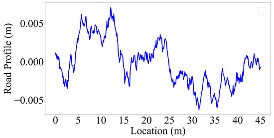 where is the roughness coefficient that represents the degree of roughness in the road classification ranging from Class A to Class H. In this study, is adopted as 16 × 10 m, which accounts for Class A profile in the road classification [52], m is the reference spatial frequency. m and m are the lower and upper spatial frequency limits, respectively. n is the spatial frequency value increased incrementally by m in the range between to . Road roughness irregularities are generated using the sum of a series of harmonics as described in Equation (3).