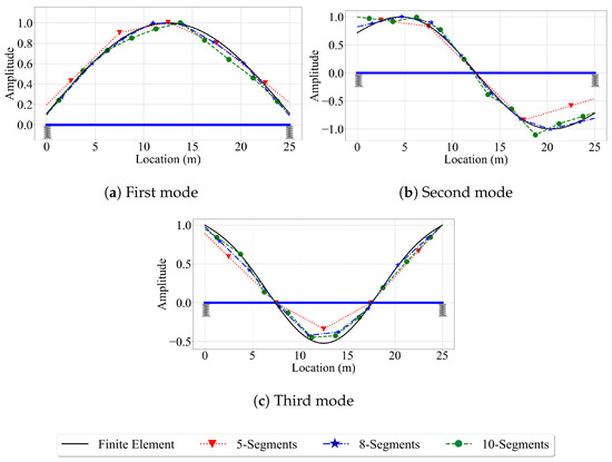 Figure 5 presents the first three mode shape estimates provided by the reference-based SSI method for different number of segments for the velocity of m/s and a time step of 0.001 s. Further, also shown in the figure are the exact mode shapes obtained from the finite element analysis and the undeformed shape of the bridge. Here, it should be noted that we positioned the reference car at different locations to achieve the best mode shape estimates for each mode. For the first mode, the reference car was placed at the middle of the bridge while, for the second and third modes, it was located 5 m away from the left support. Once the modal displacements were computed at the middle of each segment, the mode shapes were combined using straight lines. Note that other methods such as cubic spline can also be used for this purpose, but we combined the data points using straight lines because it was used in the original article [31]. The plots in Figure 5 indicate that using eight segments, resulting in 1250 data points per segment for the given vehicle velocity and time step, provided the best estimates for all three mode shapes for the single-span bridge considered in this study. While using five segments failed to provide the spatial resolution to accurately construct the mode shapes, using ten segments led to inaccuracies in the modal coordinates due to the limited number of data points at each segment. Thus, we used eight segments, which leads to a segment length of m, in applying the reference-based SSI method for the single-span bridge. For the two-span bridge, the number of segments was increased, but the segment length was kept constant to ensure the number of data points per segment was the same for the two bridges.